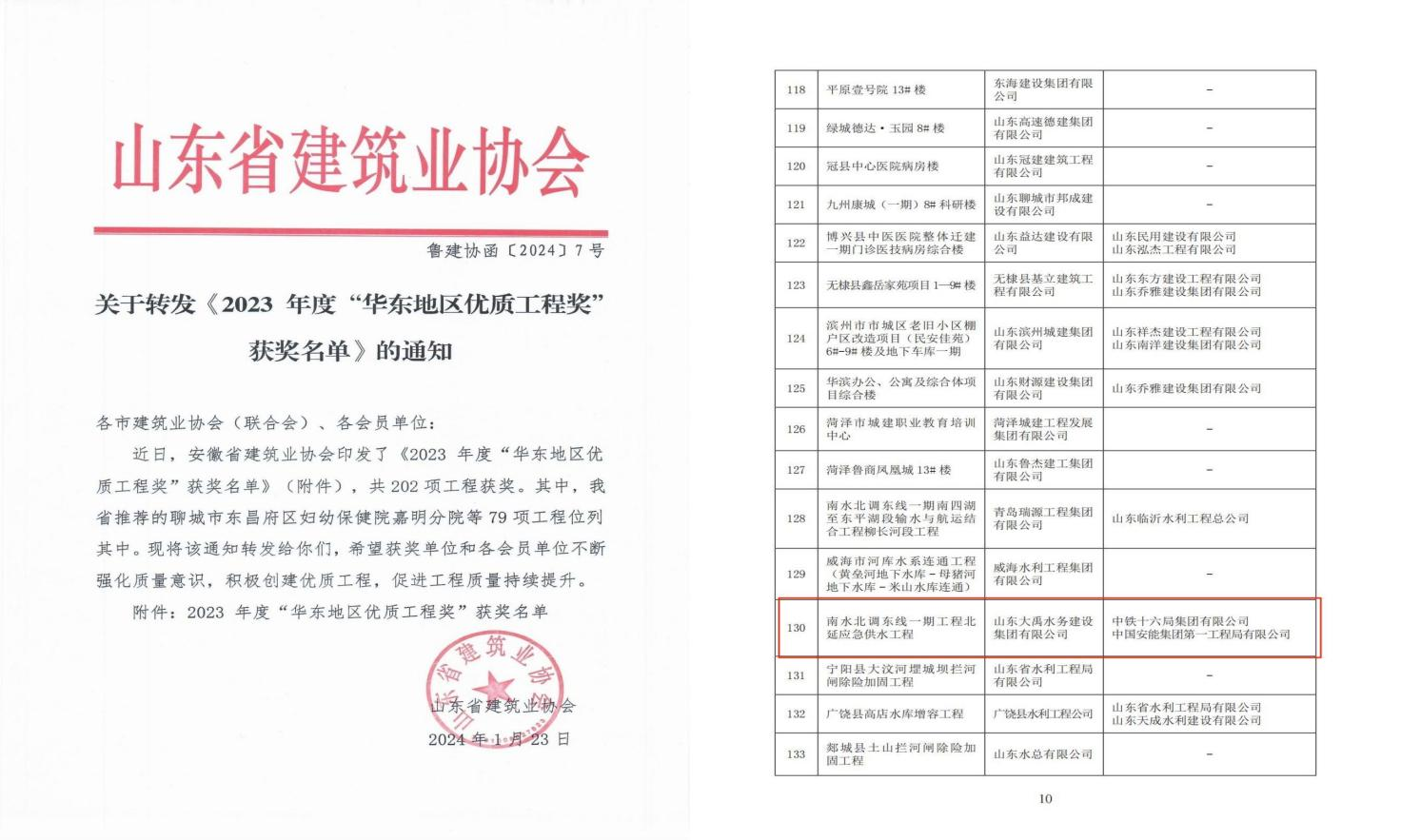 近日,山東省建筑業(yè)協(xié)會發(fā)布2023年度“華東地區(qū)優(yōu)質(zhì)工程獎”獲獎名單,經(jīng)山東省建筑業(yè)協(xié)會申報、評審委員會推薦、網(wǎng)絡公示及華東地區(qū)建筑(行)業(yè)協(xié)會聯(lián)席會與評審委員會會議審查,集團公司承建的南水北調(diào)東線一期工程北延應急供水工程憑借過硬的工程質(zhì)量在激烈的競爭中脫穎而出,榮獲2023年度“華東地區(qū)優(yōu)質(zhì)工程獎”。