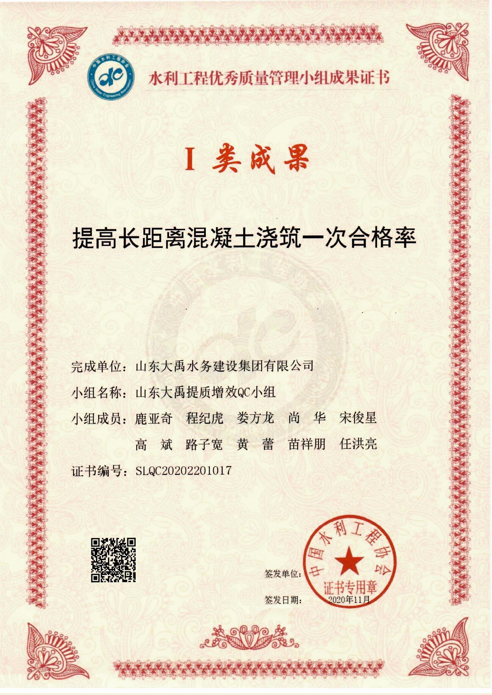 2020年QC小組I類成果證書