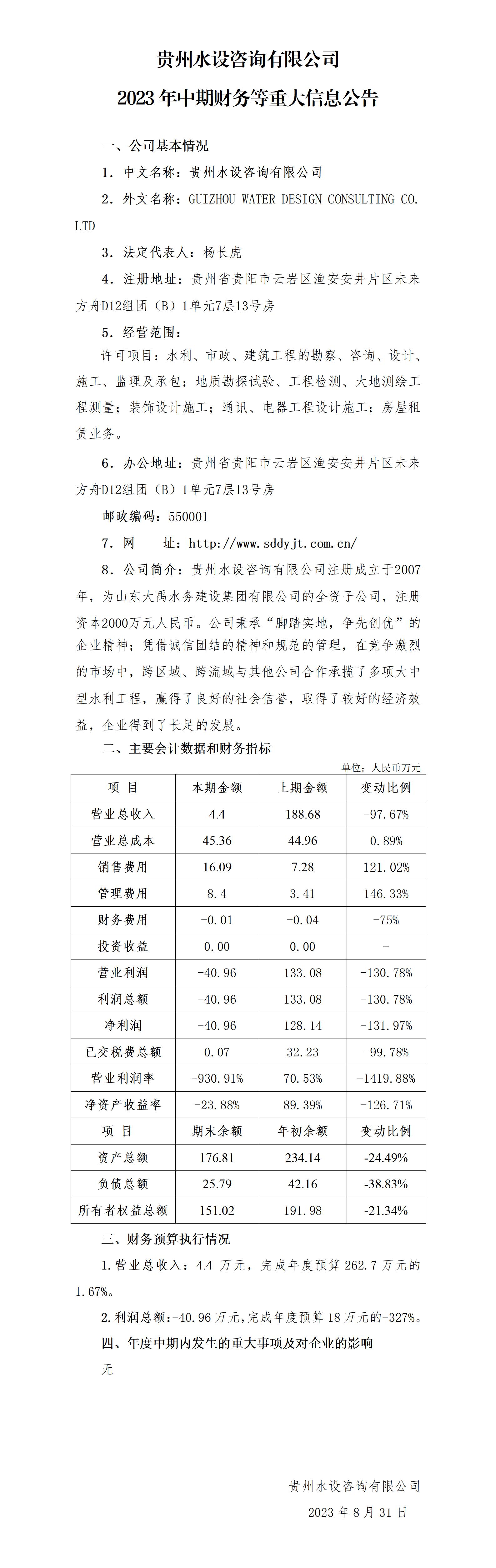 貴州水設(shè)咨詢有限公司2023年中期財(cái)務(wù)等重大信息公告
