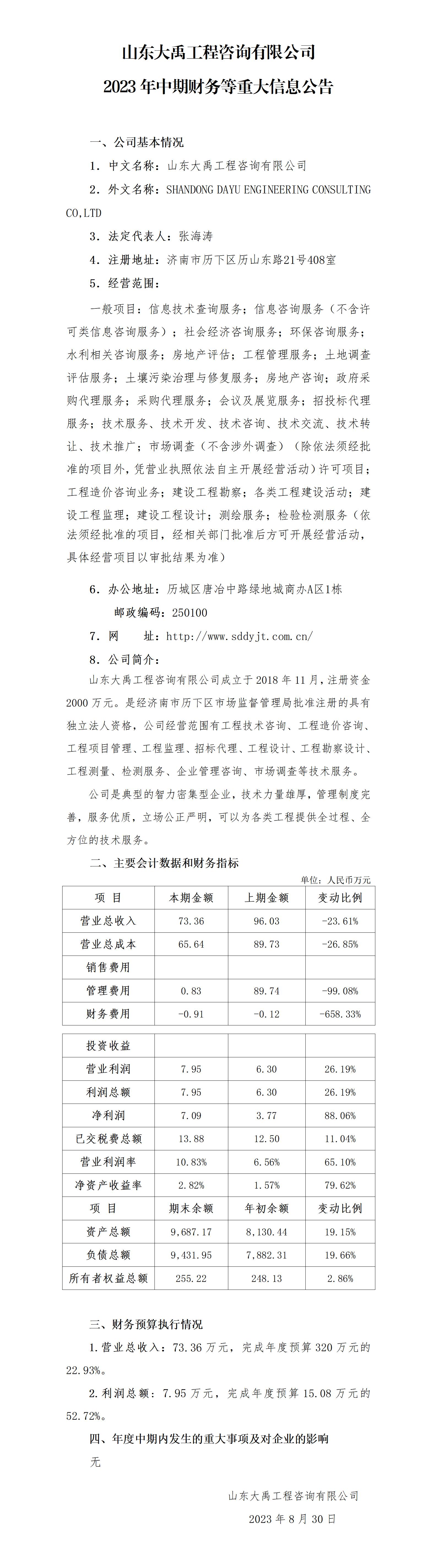 山東大禹工程咨詢有限公司2023年中期財務(wù)等重大信息公告