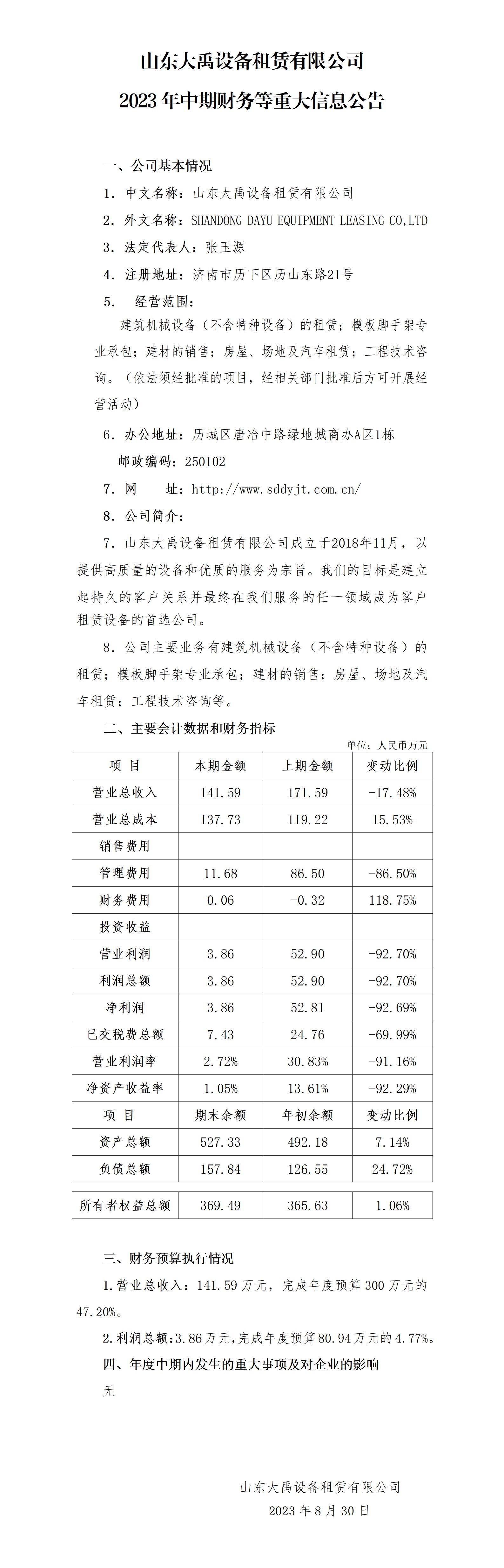 山東大禹設(shè)備租賃有限公司2023年中期財(cái)務(wù)等重大信息公告