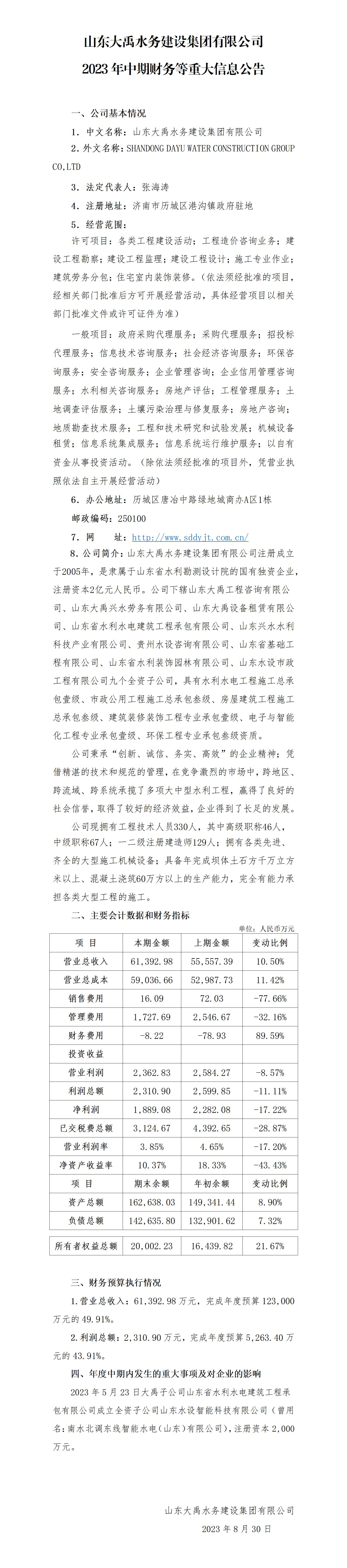 山東大禹水務(wù)建設(shè)集團(tuán)有限公司2023年中期財(cái)務(wù)等重大信息公告