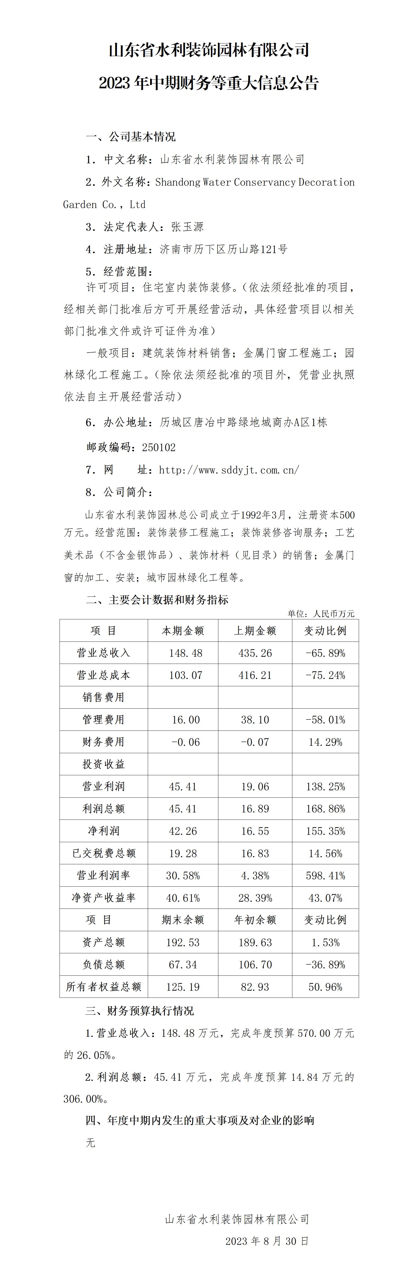 山東省水利裝飾園林有限公司2023年中期財務等重大信息公告