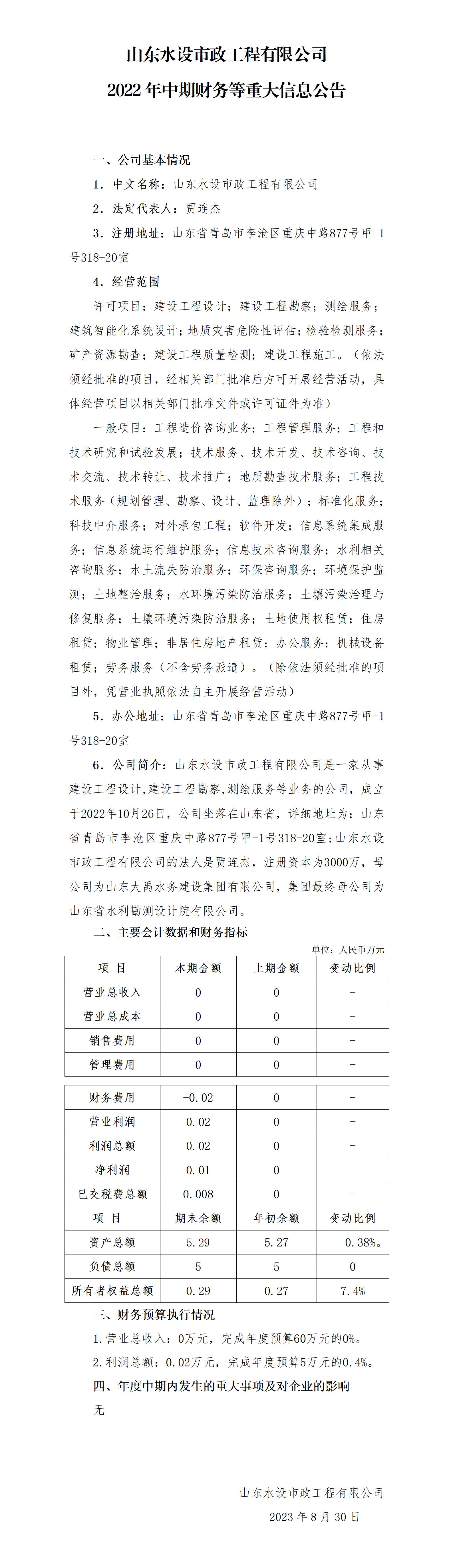 山東水設(shè)市政工程有限公司2022年中期財(cái)務(wù)等重大信息公告