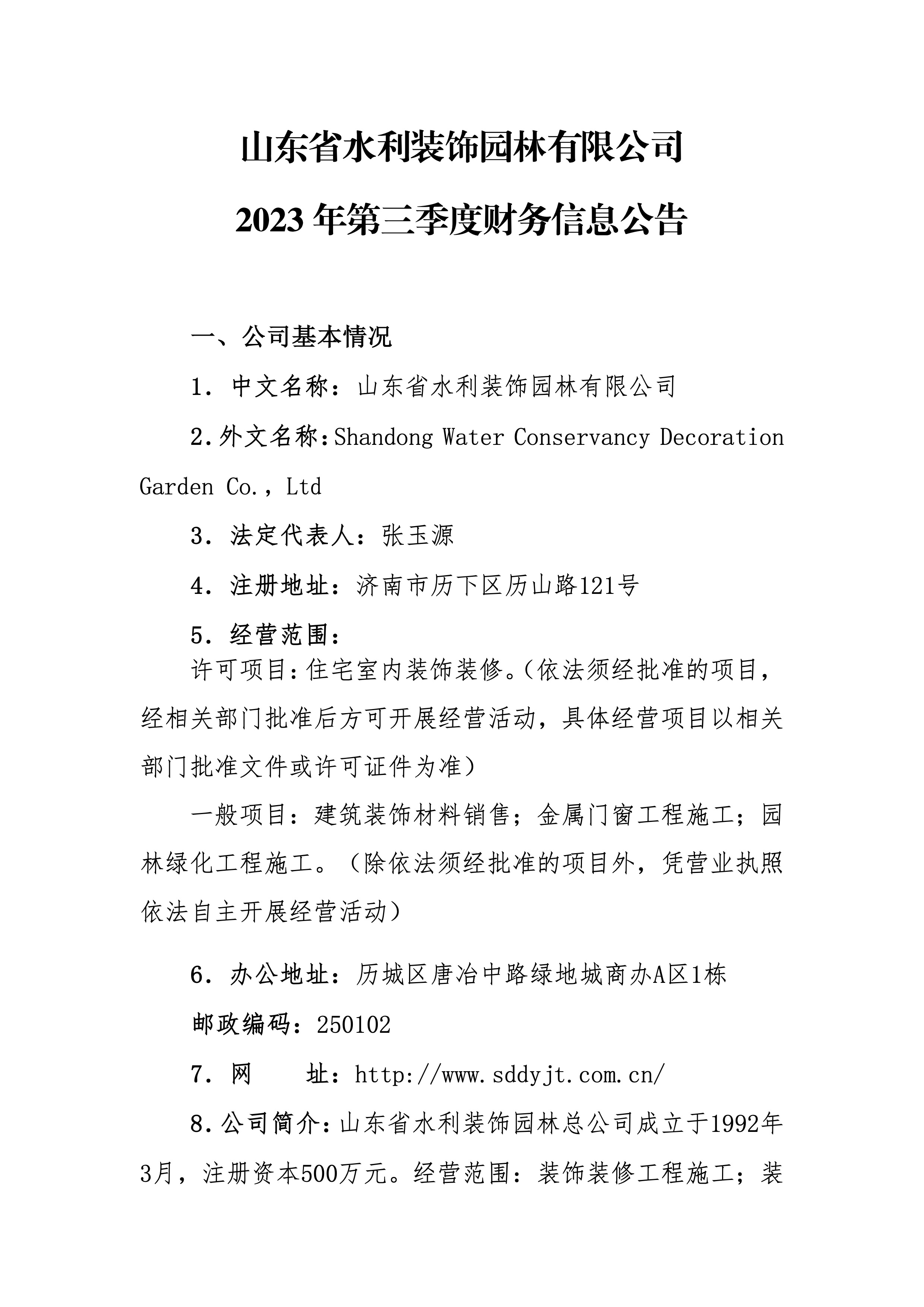 山東省水利裝飾園林有限公司2023年第三季度財務(wù)信息公告