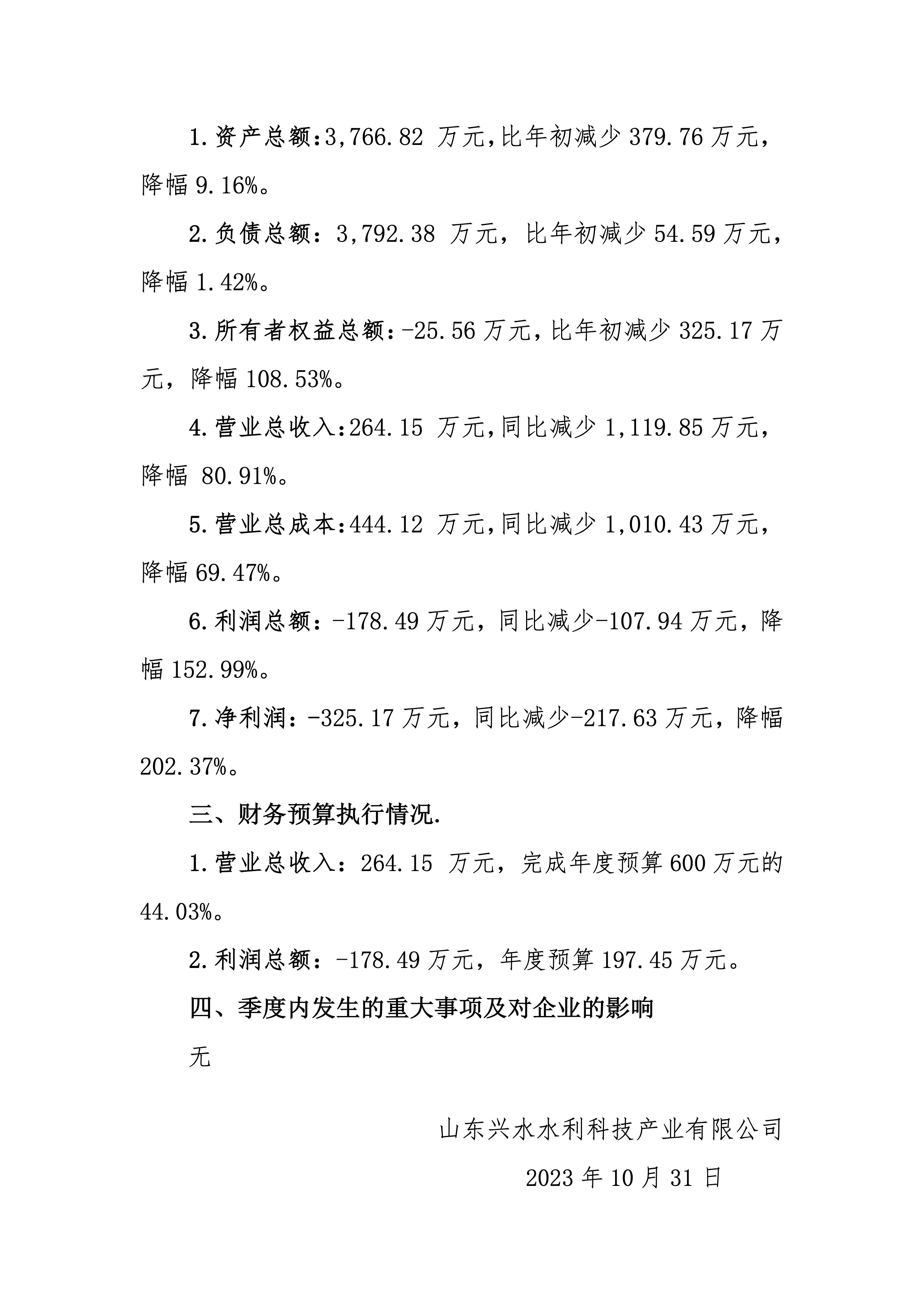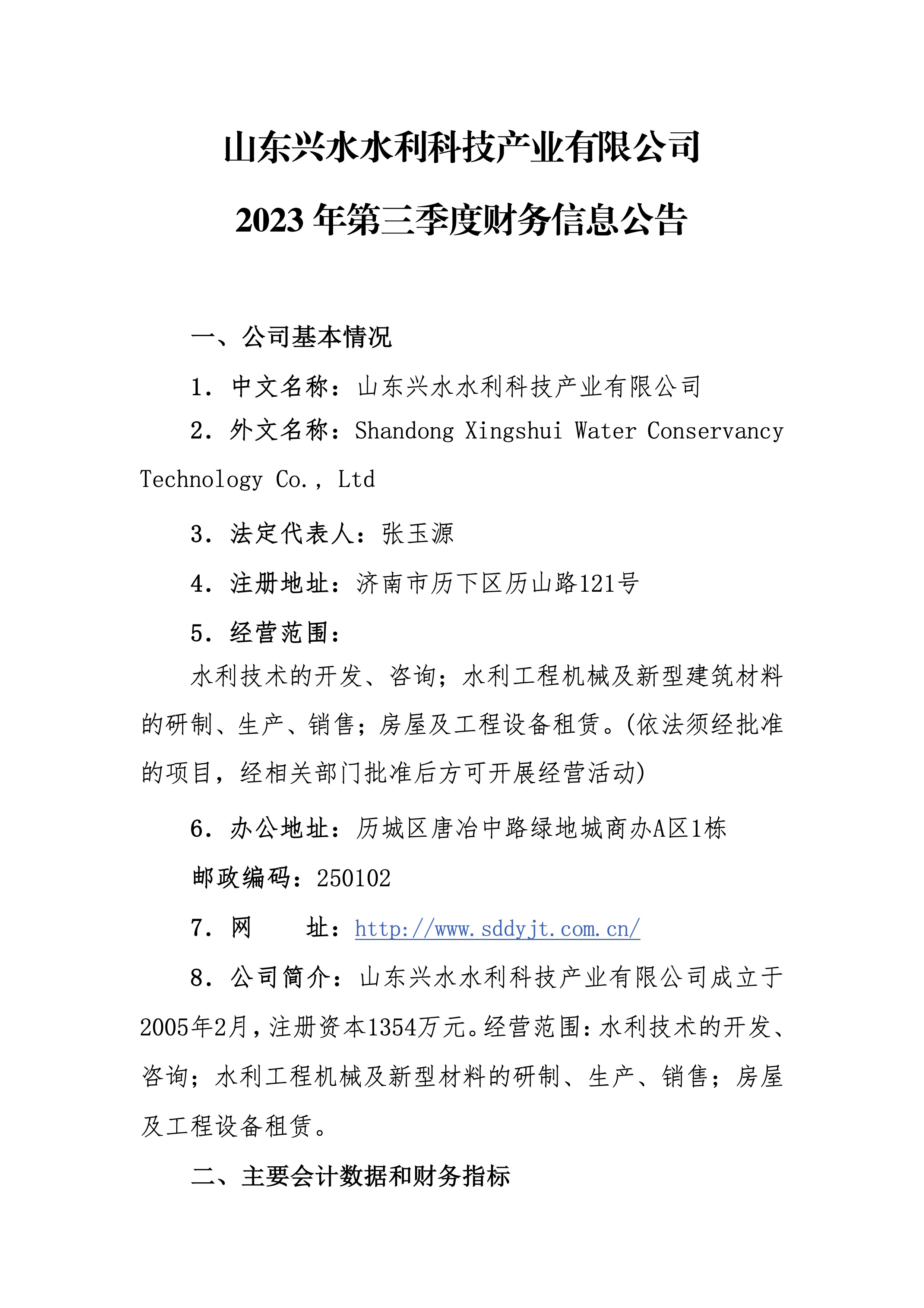 山東興水水利科技產(chǎn)業(yè)有限公司2023年第三季度財務(wù)信息公告
