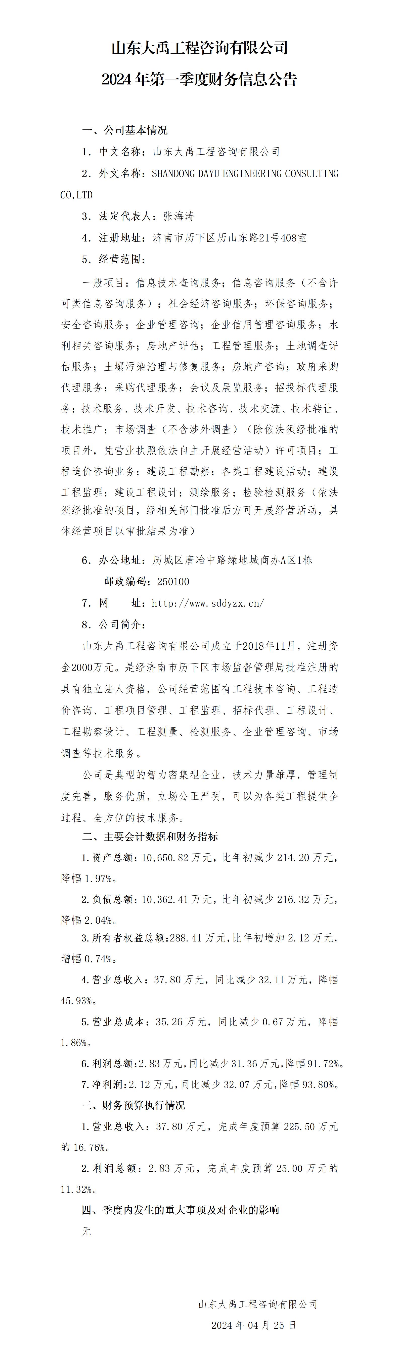 山東大禹工程咨詢有限公司2024年第一季度財(cái)務(wù)信息公告