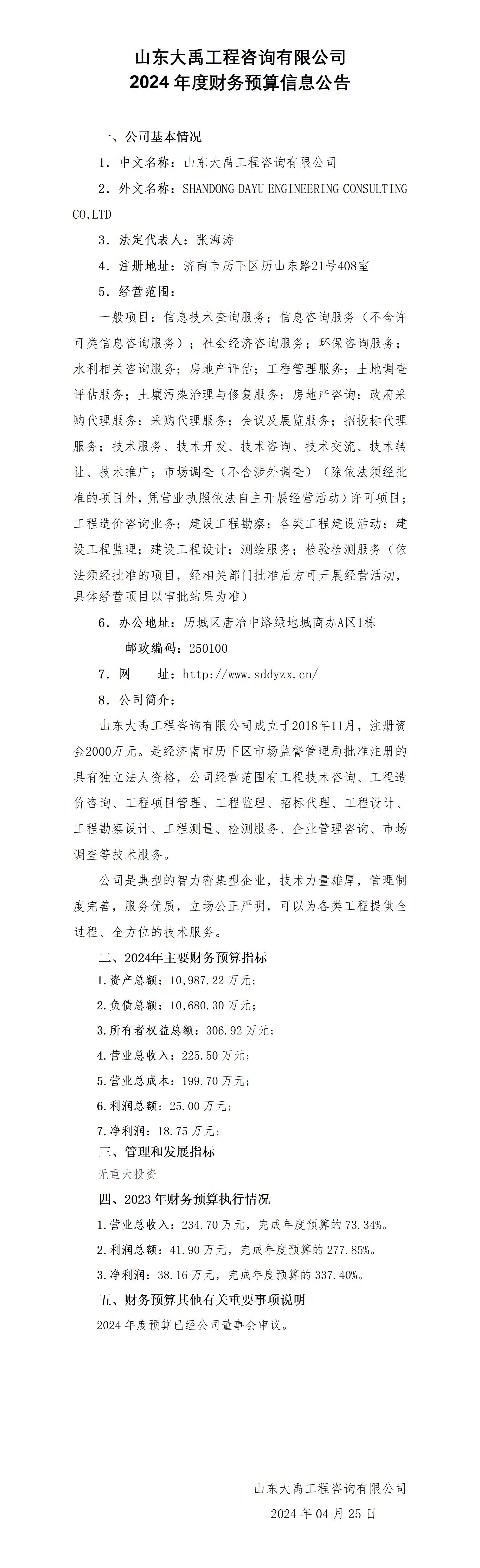 山東大禹工程咨詢有限公司2024年度財(cái)務(wù)預(yù)算信息公告