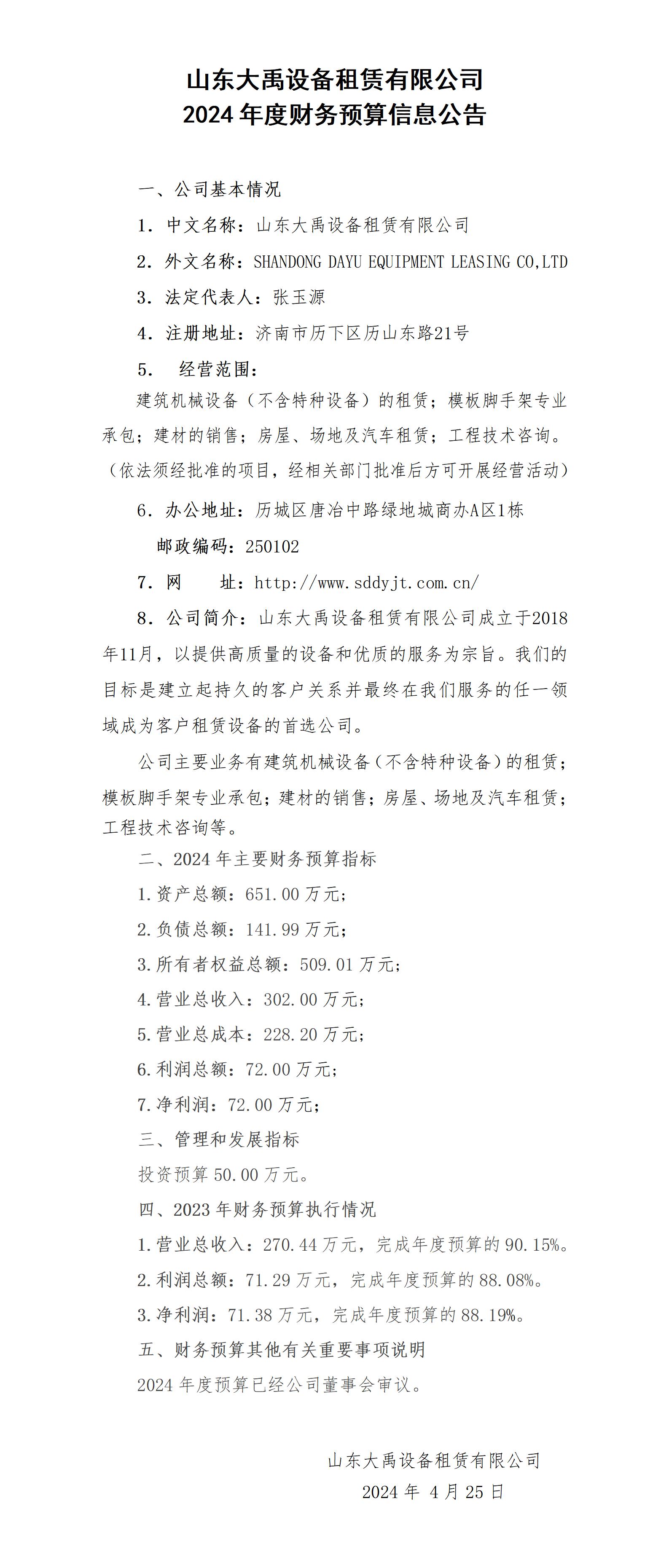 山東大禹設(shè)備租賃有限公司2024年度財務(wù)預(yù)算信息公告