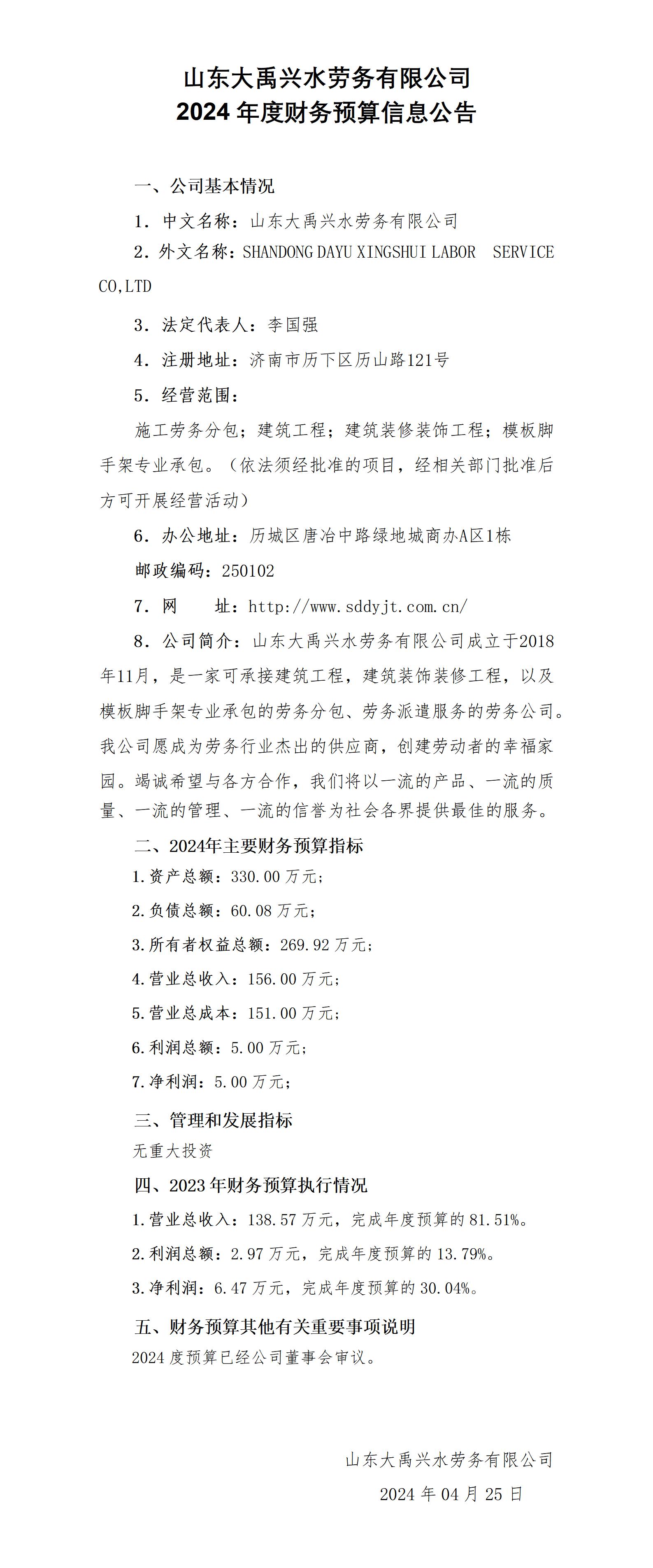 山東大禹興水勞務有限公司2024年度財務預算信息公告