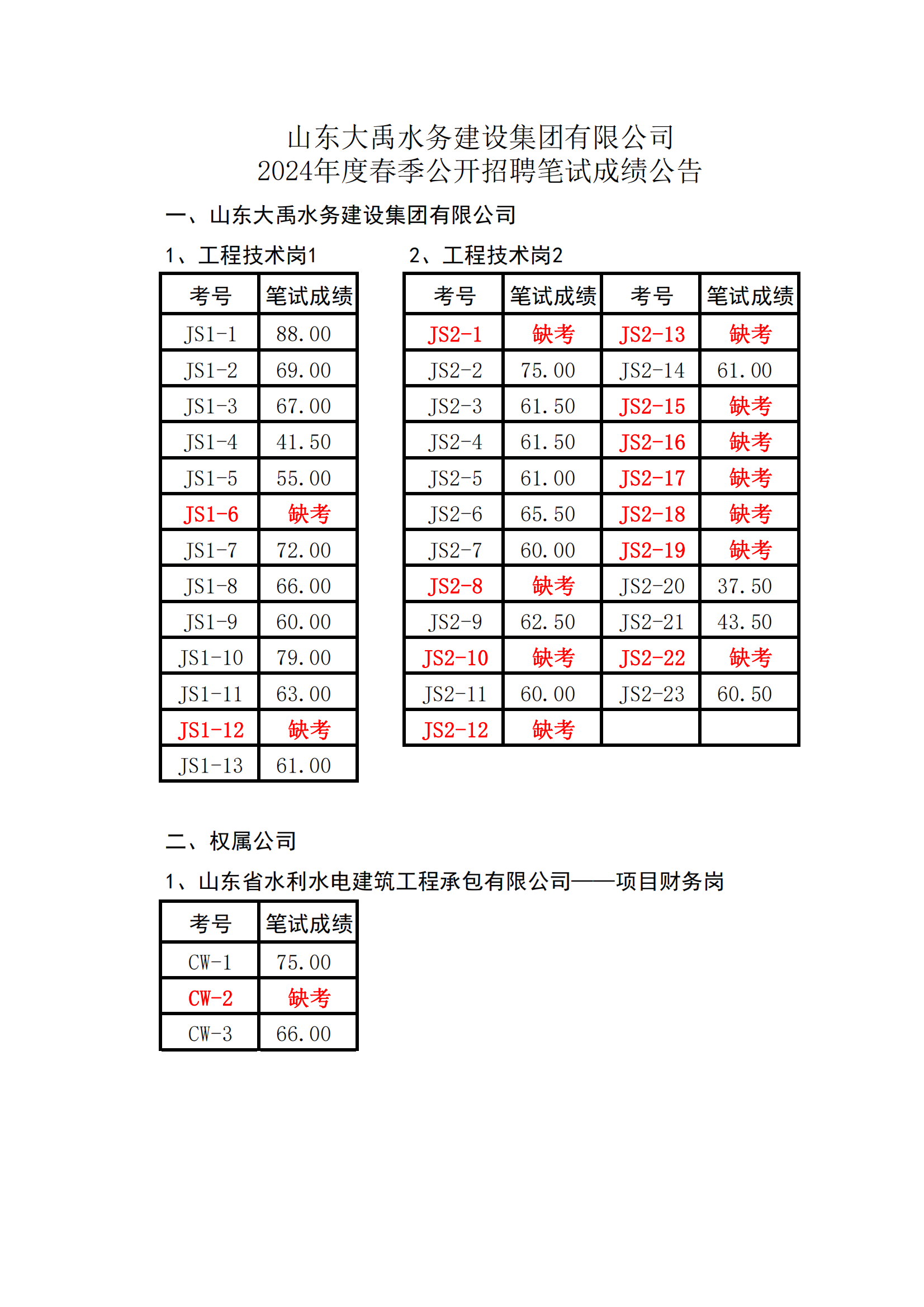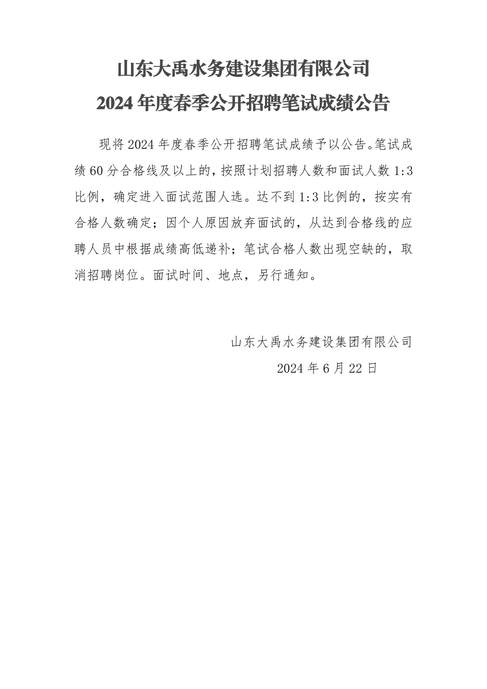 山東大禹水務(wù)建設(shè)集團(tuán)有限公司2024年度春季公開招聘筆試成績公告