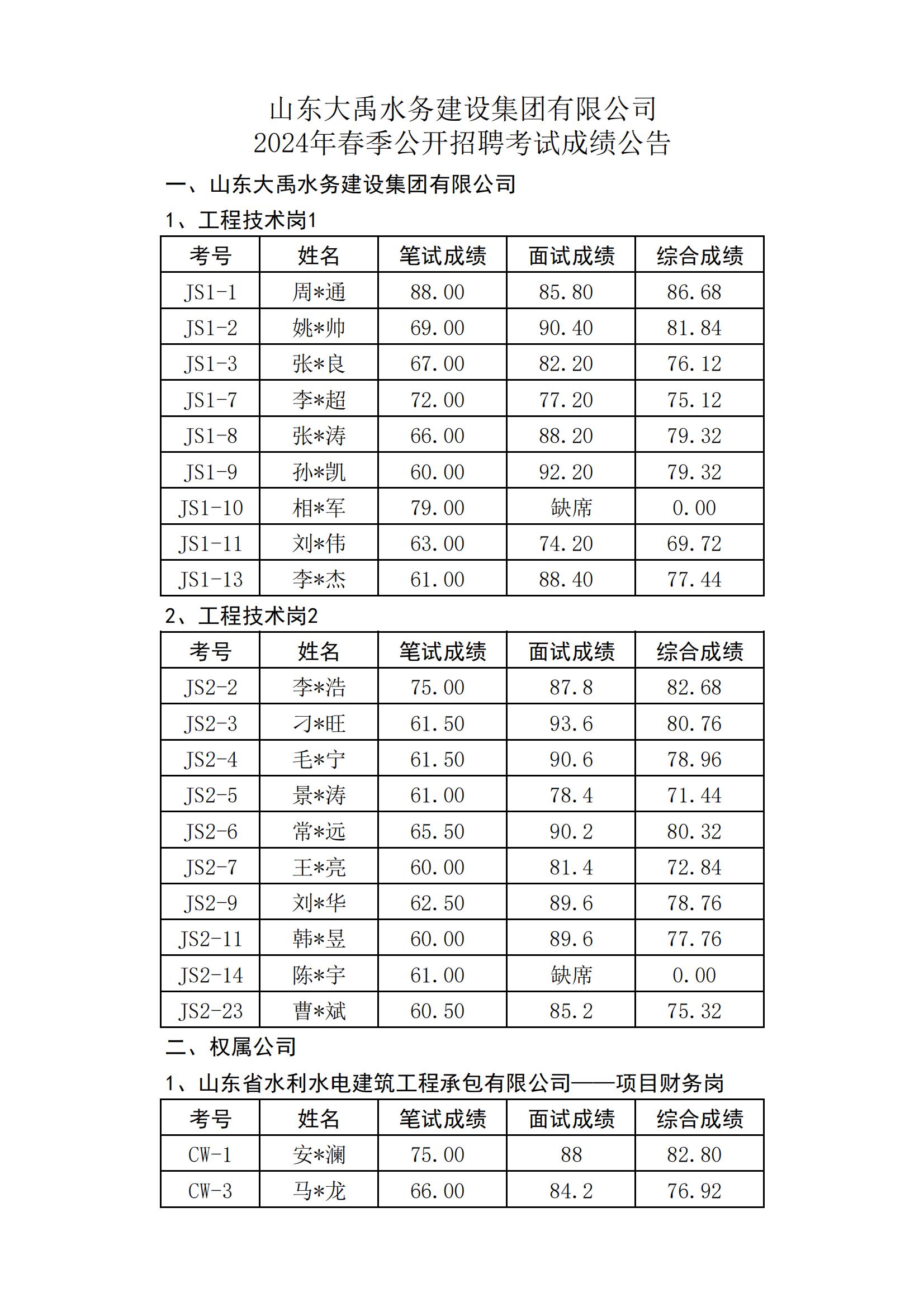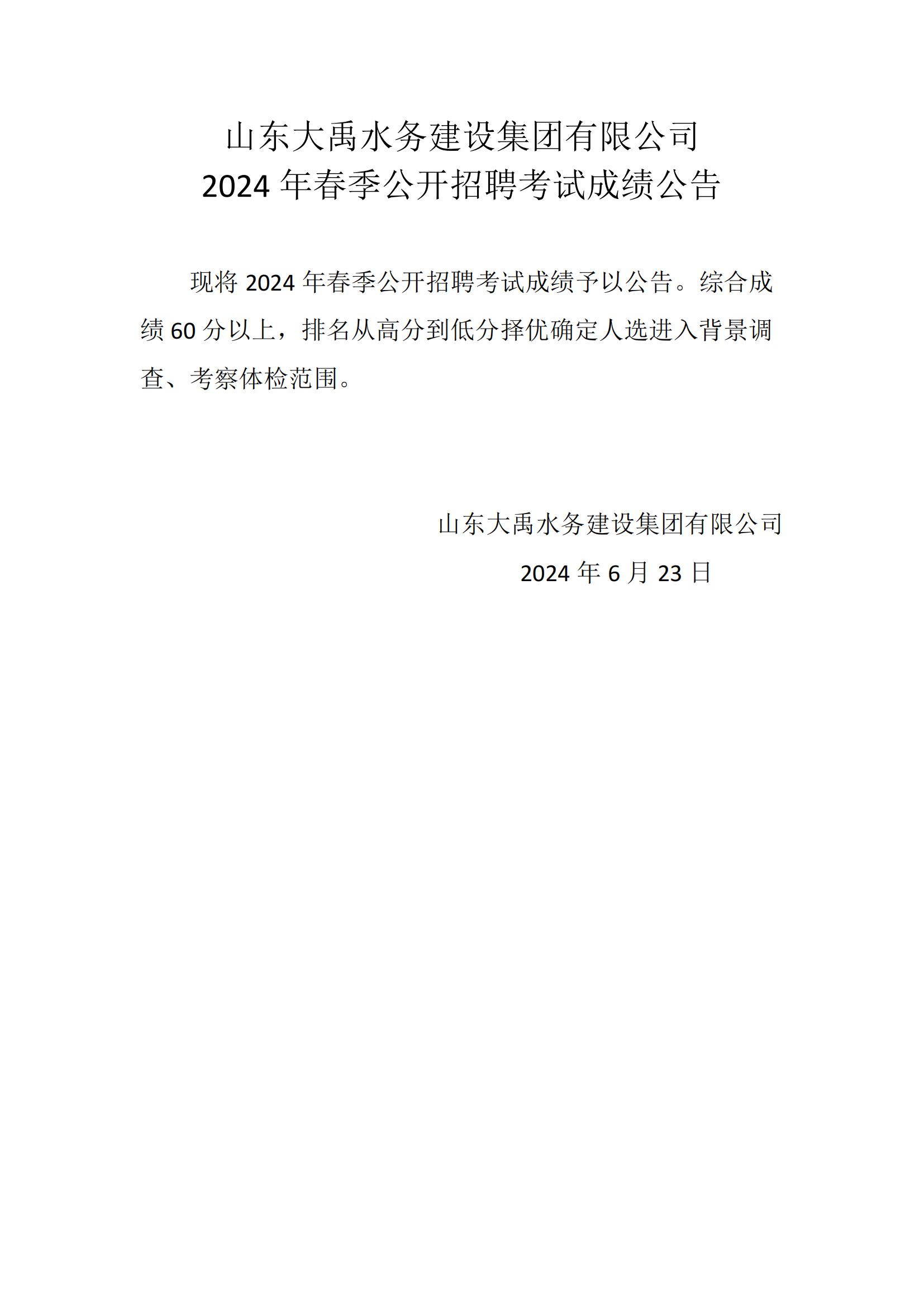 山東大禹水務(wù)建設(shè)集團(tuán)有限公司2024年度春季公開招聘筆試成績公告