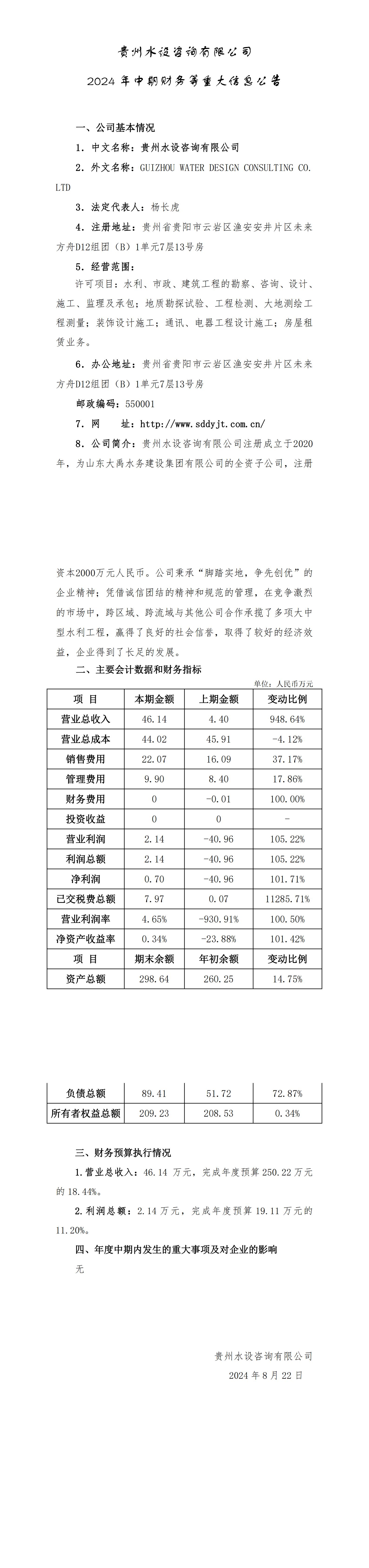 貴州水設(shè)咨詢有限公司2024年中期財(cái)務(wù)等重大信息公告