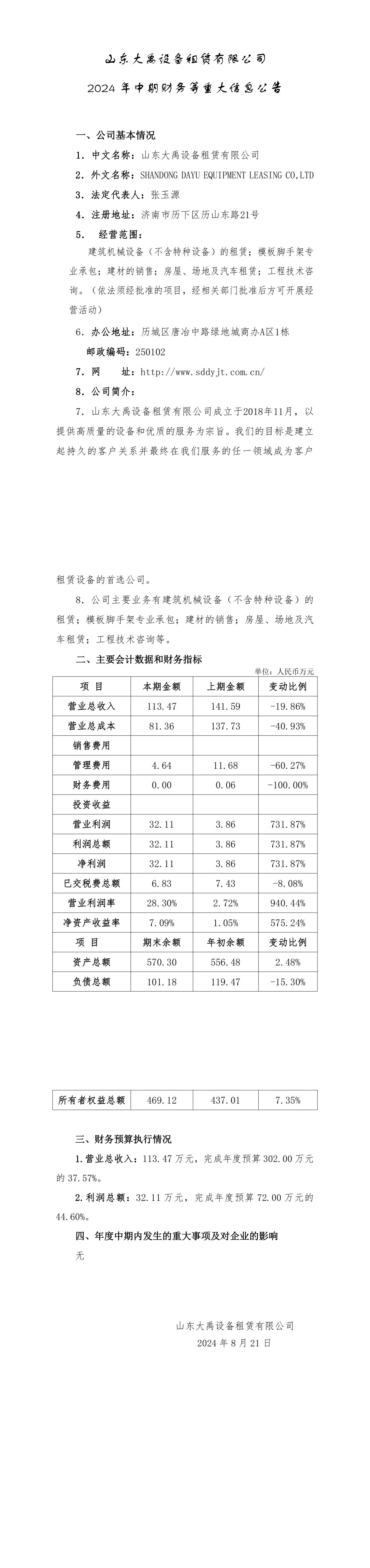 山東大禹設(shè)備租賃有限公司2024年中期財務(wù)等重大信息公告