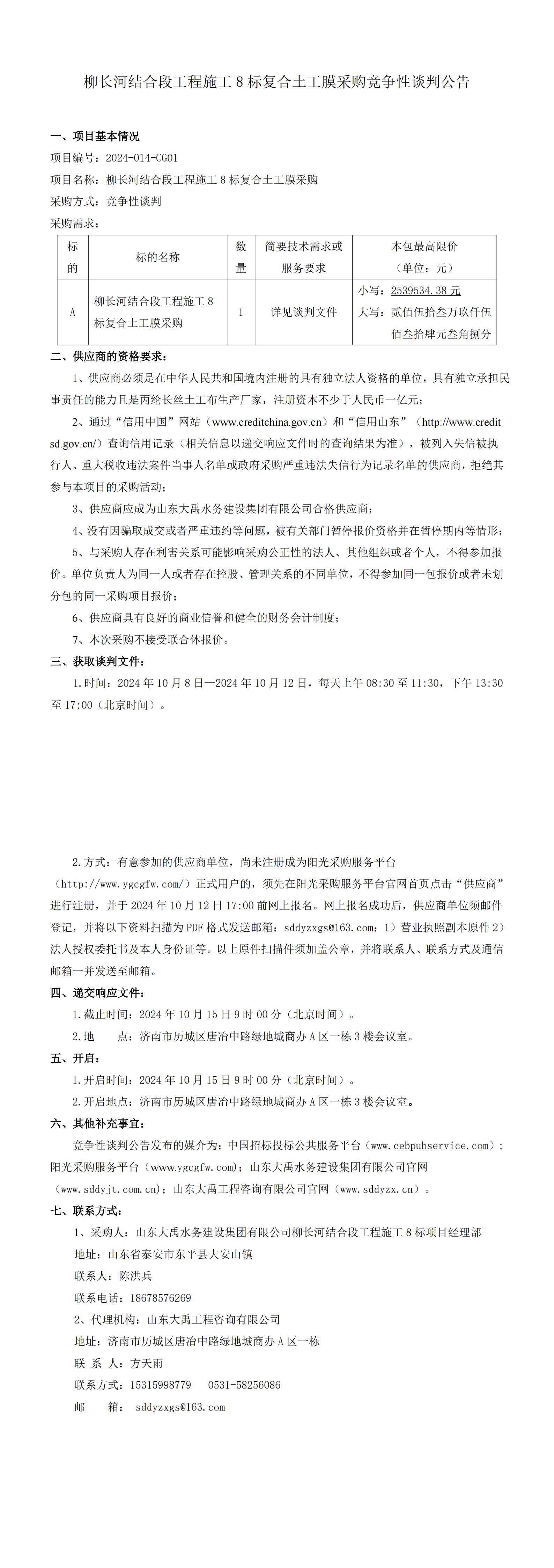 柳長河結(jié)合段工程施工 8 標復(fù)合土工膜采購競爭性談判公告