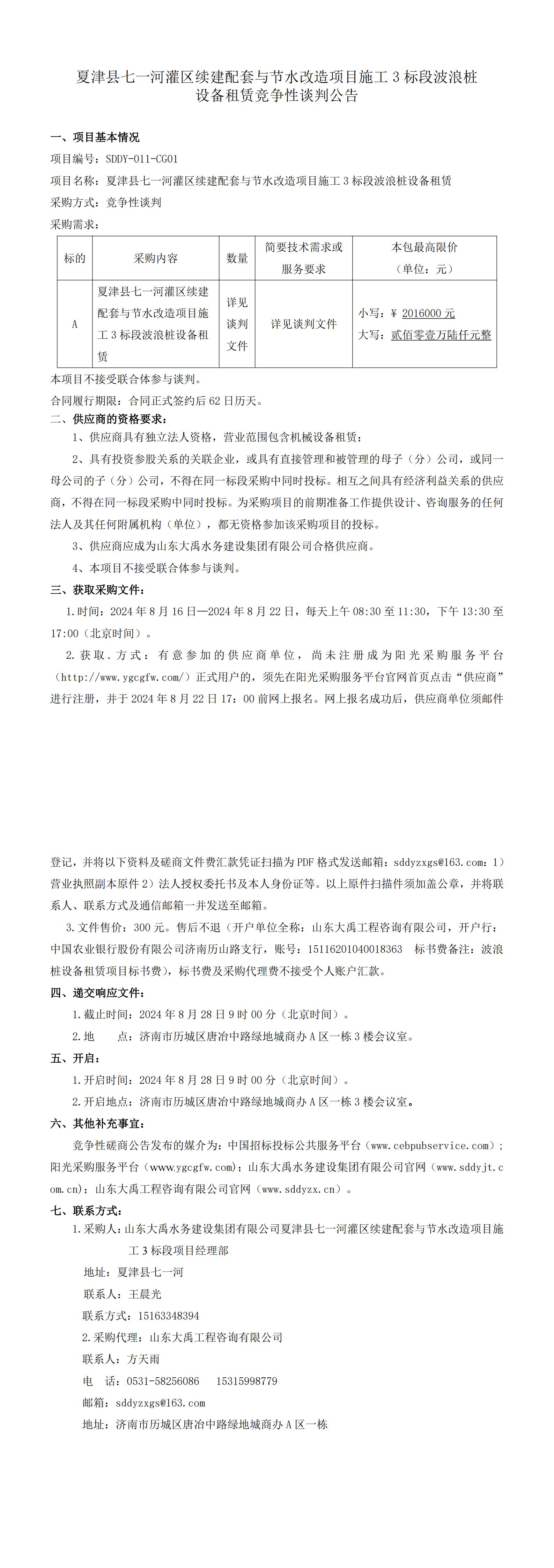 夏津縣七一河灌區(qū)續(xù)建配套與節(jié)水改造項目施工 3 標段波浪樁 設備租賃競爭性談判公告
