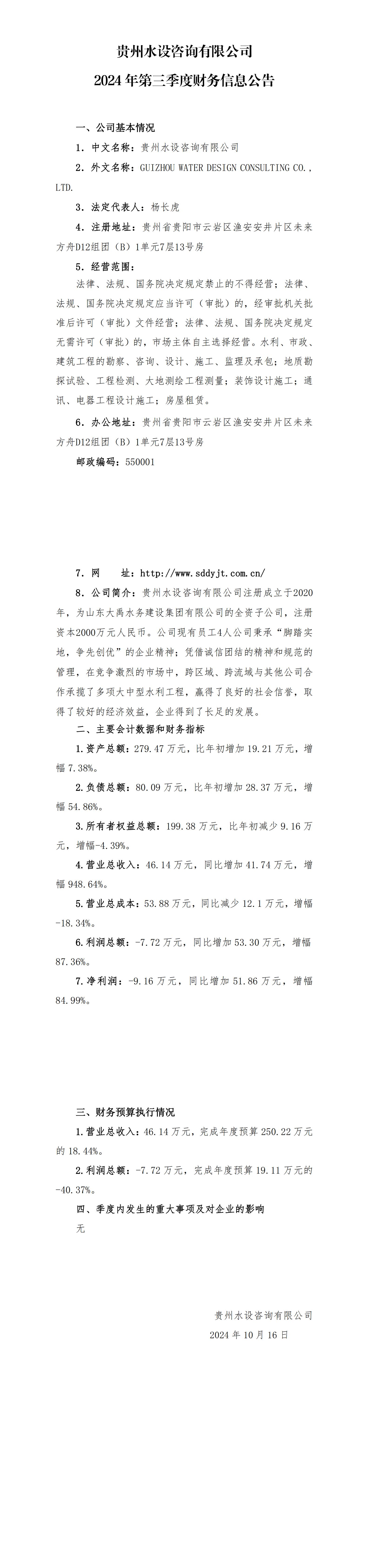 貴州水設(shè)咨詢有限公司2024年第三季度財(cái)務(wù)信息公告