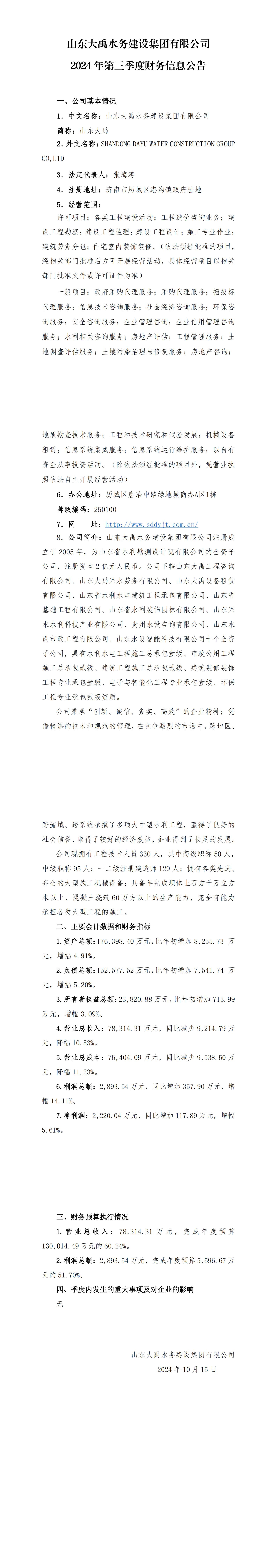 山東大禹水務(wù)建設(shè)集團(tuán)有限公司2024年第三季度財(cái)務(wù)信息公告