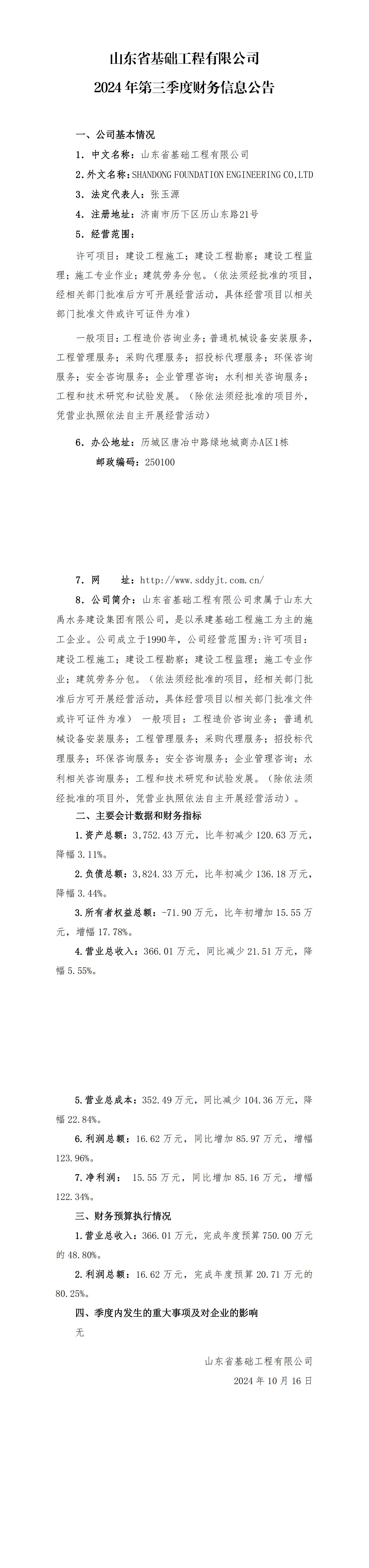 山東省基礎(chǔ)工程有限公司2024年第三季度財務(wù)信息公告