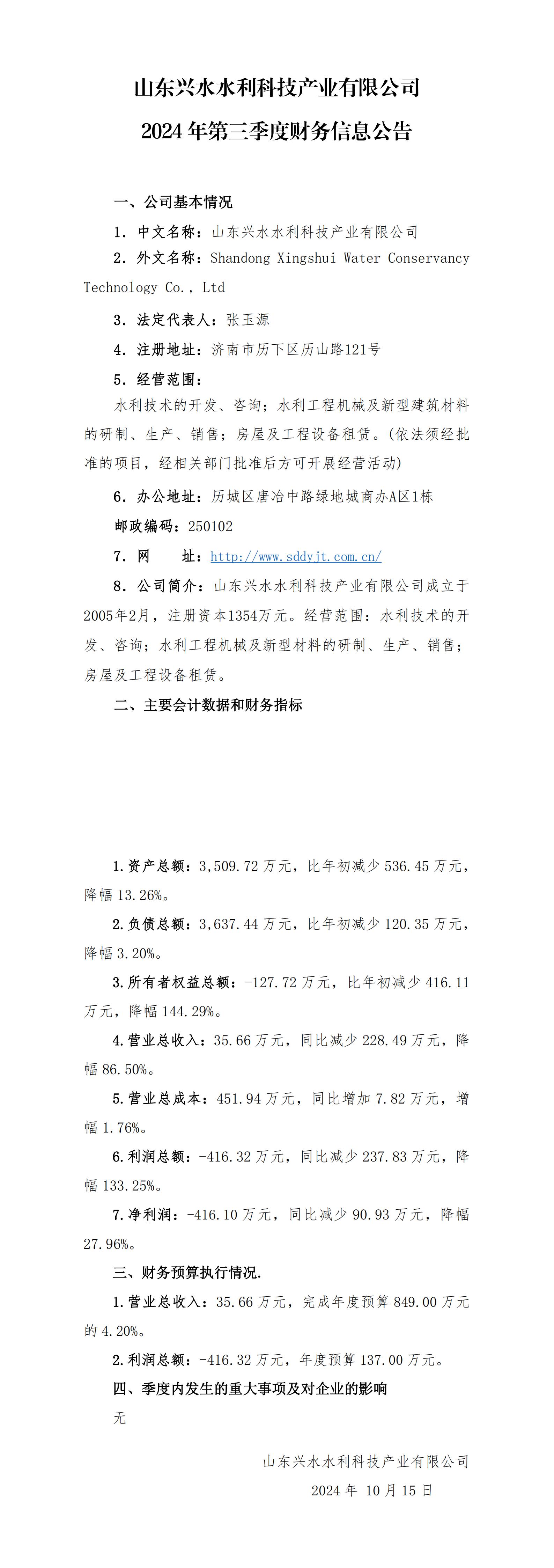 山東興水水利科技產(chǎn)業(yè)有限公司2024年第三季度財(cái)務(wù)信息公告