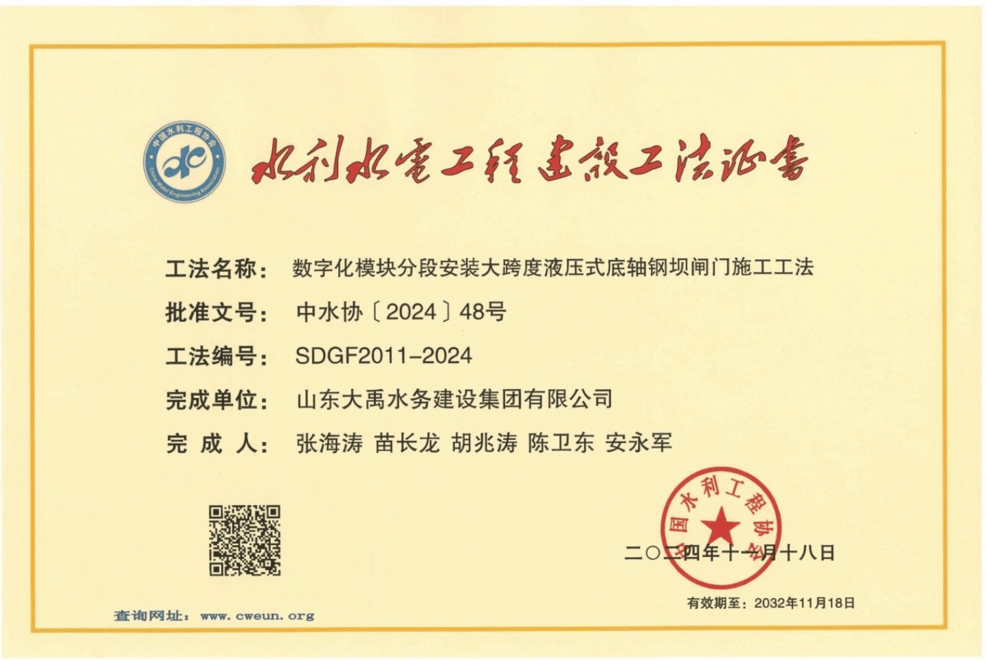 近日,集團(tuán)公司申報(bào)的《數(shù)字化模塊分段安裝大跨度液壓式底軸鋼壩閘門(mén)施工工法》《復(fù)雜環(huán)境小凈距穿越管道群大直徑頂管施工工法》《大型多跨精確留槽錨固充水式橡膠壩施工工法》《穿越高鐵運(yùn)營(yíng)線(xiàn)強(qiáng)風(fēng)化巖基底輸水鋼管施工工法》等四項(xiàng)工法獲評(píng)中國(guó)水利工程協(xié)會(huì)“2024年度水利行業(yè)工法”。