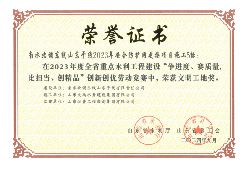 施工5標段共更換防護網54.66km,自開工以來,項目部職工克服施工戰(zhàn)線長、施工作業(yè)面多等管理困難,精心組織施工,合理安排工期,嚴格質量控制,狠抓安全管理,順利完成施工任務,得到建設、監(jiān)理等單位的高度認可,并榮獲山東省水利廳和山東省總工會組織的2023年度全省重點水利工程建設“爭進度、賽質量,比擔當、創(chuàng)精品”創(chuàng)新創(chuàng)優(yōu)勞動競賽文明工地獎。