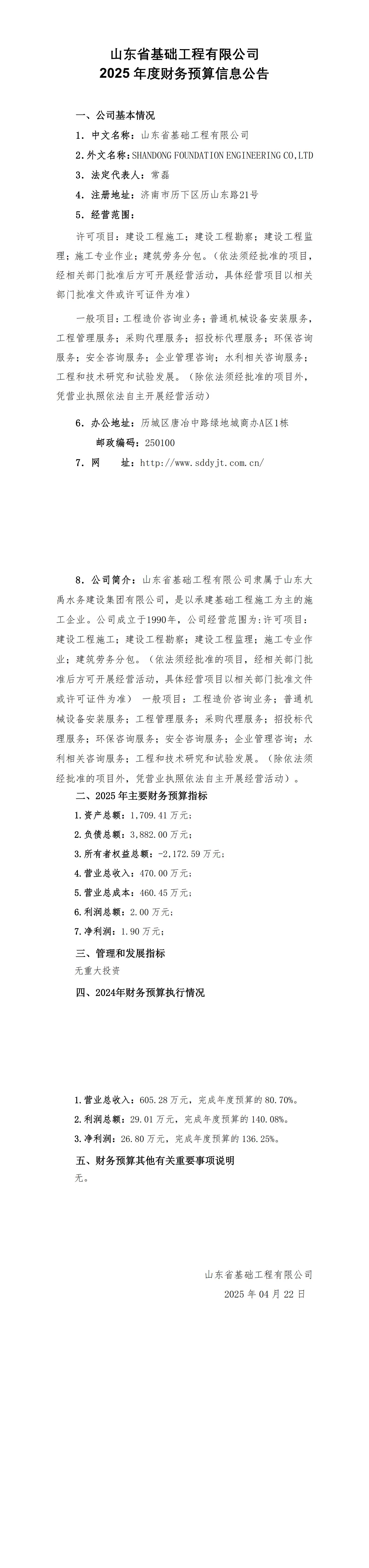 山東省基礎(chǔ)工程有限公司2025年度財(cái)務(wù)預(yù)算信息公告