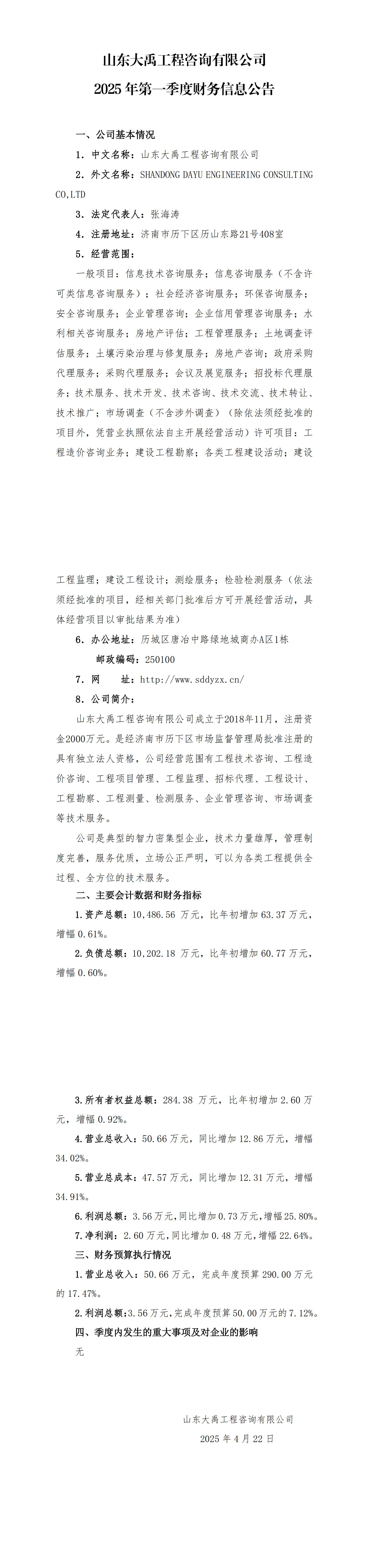 山東大禹工程咨詢有限公司2025年第一季度財務(wù)信息公告