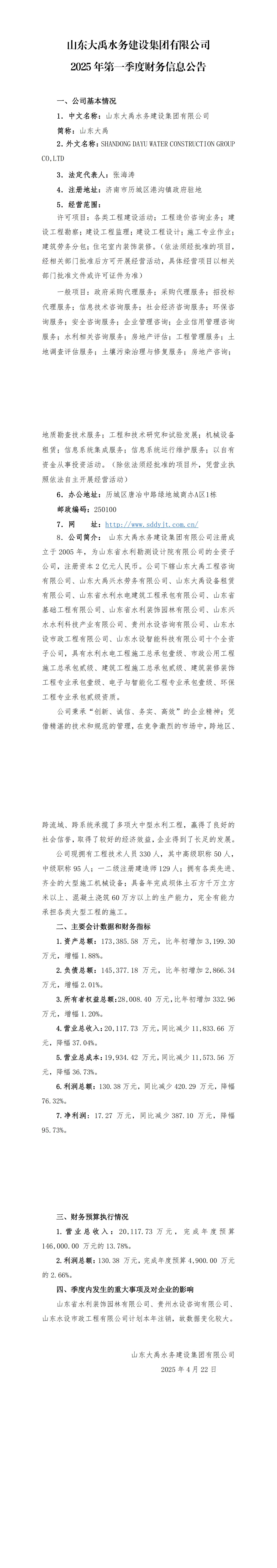 山東大禹水務(wù)建設(shè)集團(tuán)有限公司2025年第一季度財(cái)務(wù)信息公告