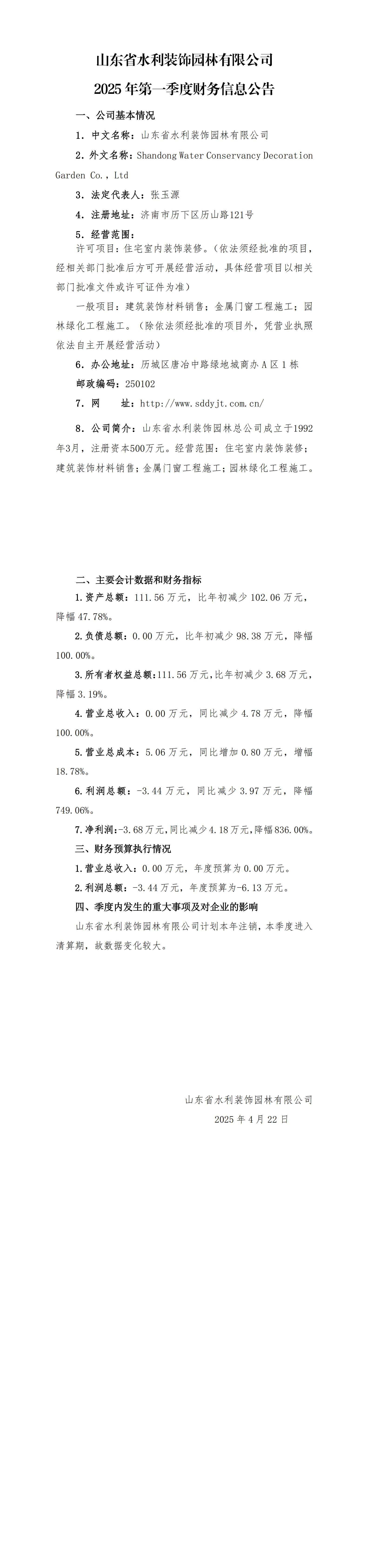 山東省水利裝飾園林有限公司2025年第一季度財務(wù)信息公告