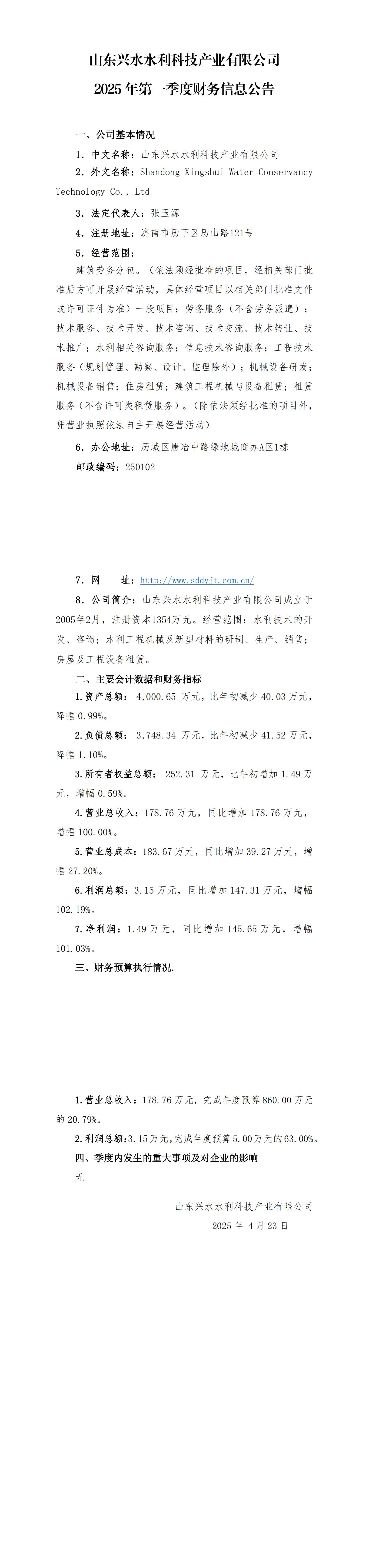 山東興水水利科技產(chǎn)業(yè)有限公司2025年第一季度財務(wù)信息公告