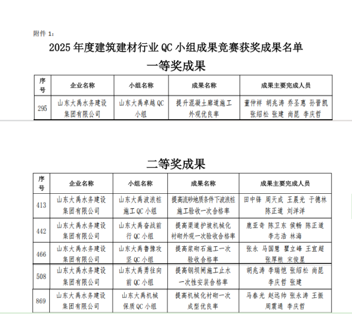 近日,山東省建筑業(yè)協(xié)會(huì)公布2025年度建筑建材行業(yè)QC小組成果競賽結(jié)果,集團(tuán)公司申報(bào)的“提升混凝土廊道施工外觀優(yōu)良率”等6項(xiàng)成果經(jīng)過申報(bào)、地市推薦、初賽、現(xiàn)場發(fā)布和專家評審等環(huán)節(jié),1項(xiàng)榮獲一等獎(jiǎng)成果,5項(xiàng)榮獲二等獎(jiǎng)成果。