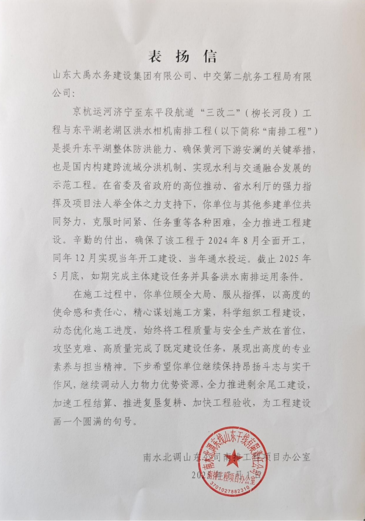 近日,集團(tuán)公司收到一封滿含認(rèn)可與鼓勵(lì)的表揚(yáng)信,表揚(yáng)集團(tuán)公司在京杭運(yùn)河濟(jì)寧至東平段航道 “三改二”(柳長河段)工程與東平湖老湖區(qū)洪水相機(jī)南排工程航運(yùn)與洪水南排結(jié)合段施工8標(biāo)的施工過程中精心組織、攻堅(jiān)克難,高質(zhì)量完成既定建設(shè)任務(wù),為工程按期投入使用打下堅(jiān)實(shí)基礎(chǔ)。