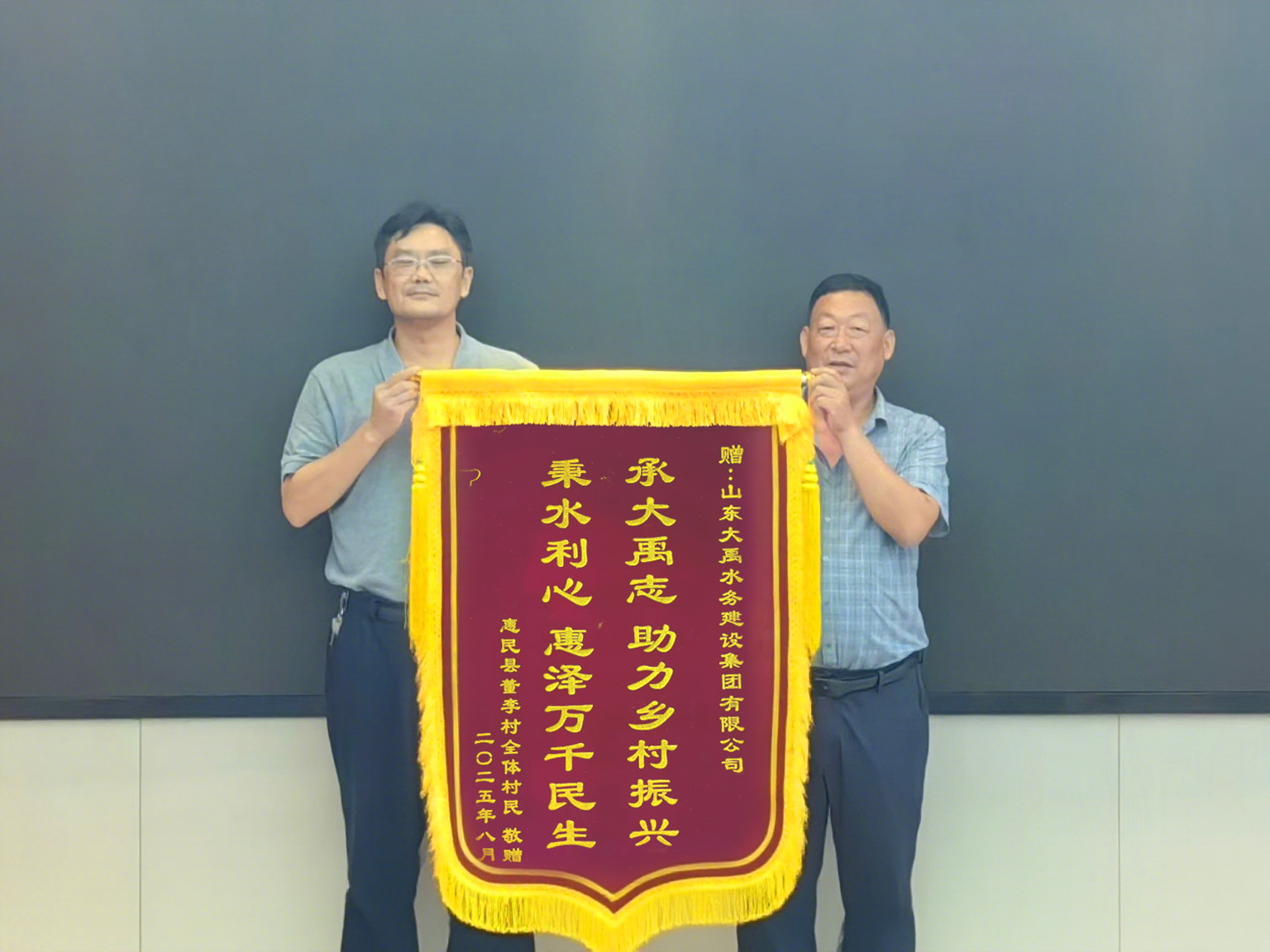 8月6日,惠民縣董李村村書記及村民代表將一面繡有“承大禹志,助力鄉(xiāng)村振興;秉水利心,惠澤萬千民生”的錦旗送至集團公司,對集團公司在結(jié)對幫扶、鄉(xiāng)村振興工作中做出的貢獻表示衷心感謝。