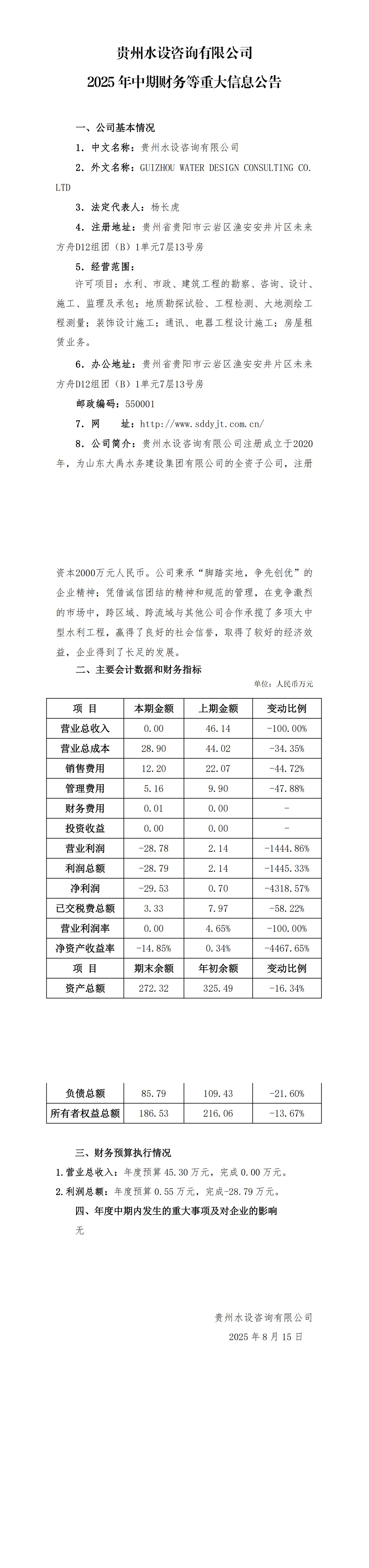 貴州水設(shè)咨詢有限公司2025年中期財務(wù)等重大信息公告