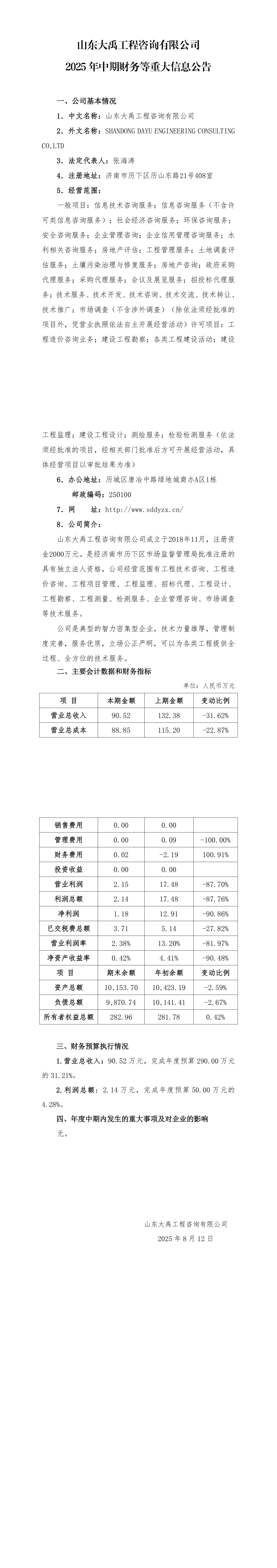 山東大禹工程咨詢(xún)有限公司2025年中期財(cái)務(wù)等重大信息公告