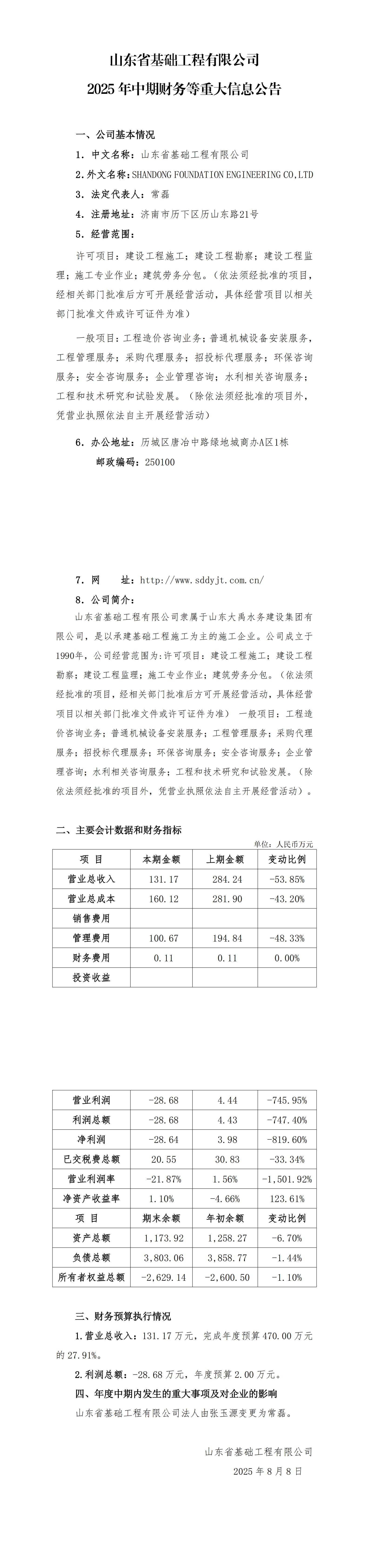 山東省基礎(chǔ)工程有限公司2025年中期財(cái)務(wù)等重大信息公告