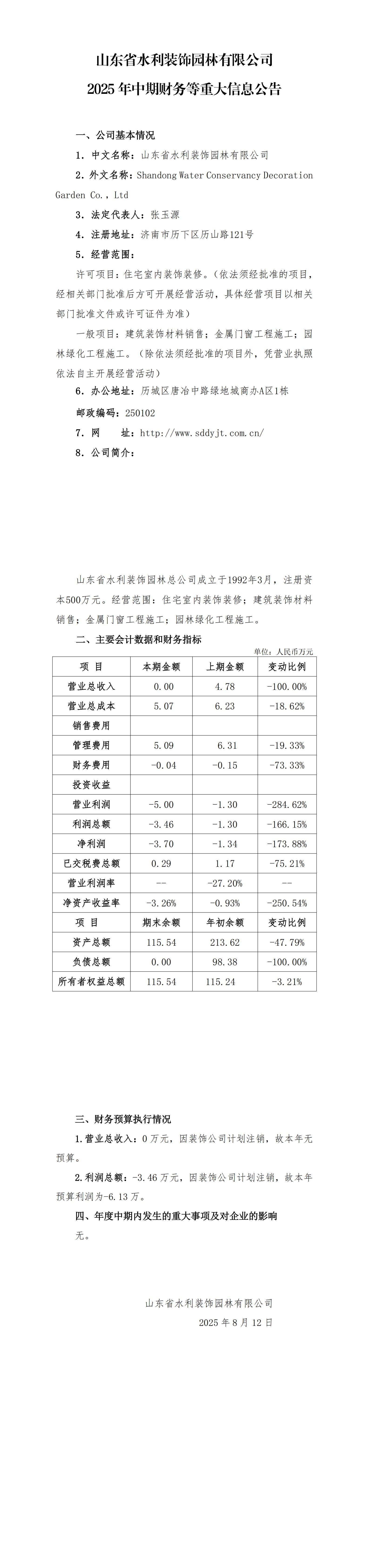 山東省水利裝飾園林有限公司2025年中期財務(wù)等重大信息公告