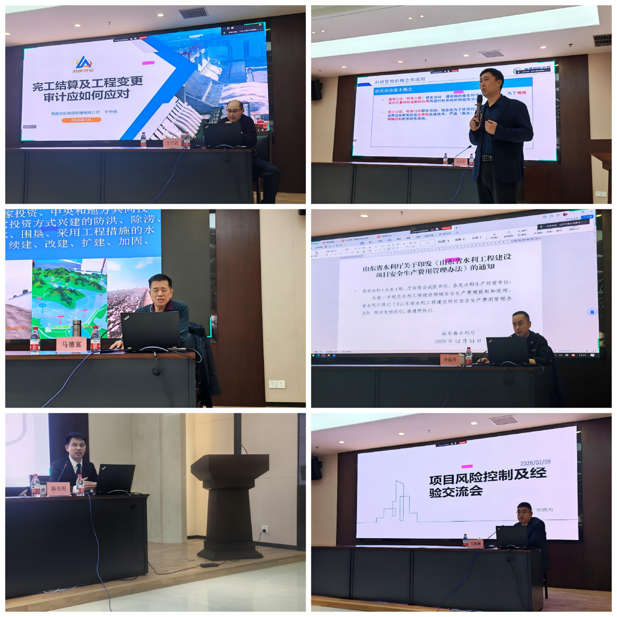 集團(tuán)公司精心規(guī)劃課程,邀請(qǐng)了山東海逸恒安工程咨詢管理有限公司咨詢五部副經(jīng)理于中武、山東省水利科學(xué)研究院研究員馬德富、山東瑞諾知識(shí)產(chǎn)權(quán)代理有限公司副總經(jīng)理孟憲峰、山東康橋律師事務(wù)所高級(jí)合伙人韓傳明、山東省水利科學(xué)研究院安全副總工程師李福仲等行業(yè)內(nèi)資深專家、專業(yè)機(jī)構(gòu)骨干進(jìn)行授課。集團(tuán)公司工程部主任張振海組織開展項(xiàng)目風(fēng)險(xiǎn)控制及經(jīng)驗(yàn)交流會(huì),課程內(nèi)容緊扣水利工程建設(shè)項(xiàng)目管理實(shí)際需求,涵蓋完工結(jié)算及工程變更審計(jì)、水利工程質(zhì)量控制要點(diǎn)、科研創(chuàng)新政策解讀與研發(fā)合規(guī)管理、建工領(lǐng)域常見法律風(fēng)險(xiǎn)與防范、施工現(xiàn)場(chǎng)安全管理及安全生產(chǎn)費(fèi)用使用范圍解讀、項(xiàng)目風(fēng)險(xiǎn)管控及經(jīng)驗(yàn)交流等多個(gè)核心模塊,兼具專業(yè)性、實(shí)用性和指導(dǎo)性,為參訓(xùn)人員搭建了系統(tǒng)學(xué)習(xí)、交流提升的優(yōu)質(zhì)平臺(tái)。