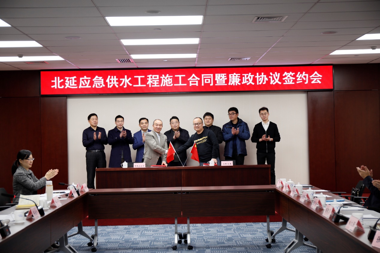 2019年12月13日,南水北調(diào)東線一期工程北延應(yīng)急供水工程施工合同暨廉政協(xié)議簽約儀式在北京舉行。南水北調(diào)東線總公司趙登峰總經(jīng)理、高必華副總經(jīng)理、集團(tuán)公司張海濤董事長(zhǎng)、陳鳳振副總經(jīng)理出席簽約儀式。