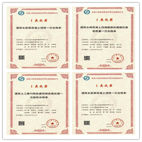 本次水利工程優(yōu)秀質(zhì)量管理小組成果評(píng)價(jià),全國(guó)共申報(bào)1006項(xiàng)成果,涉及水利施工、設(shè)計(jì)、監(jiān)理、咨詢等單位。經(jīng)專家組初審、復(fù)審、現(xiàn)場(chǎng)評(píng)價(jià)等環(huán)節(jié),最終確定701項(xiàng)水利工程優(yōu)秀質(zhì)量管理小組獲獎(jiǎng)。其中一類成果216項(xiàng),二類成果356項(xiàng),三類成果189項(xiàng)。大禹集團(tuán)本次申報(bào)的7項(xiàng)成果,其中《提高六棱預(yù)制板外觀質(zhì)量合格率》等四項(xiàng)課題榮獲一類成果,《提高混凝土外觀優(yōu)良率》等三項(xiàng)課題榮獲二類成果。