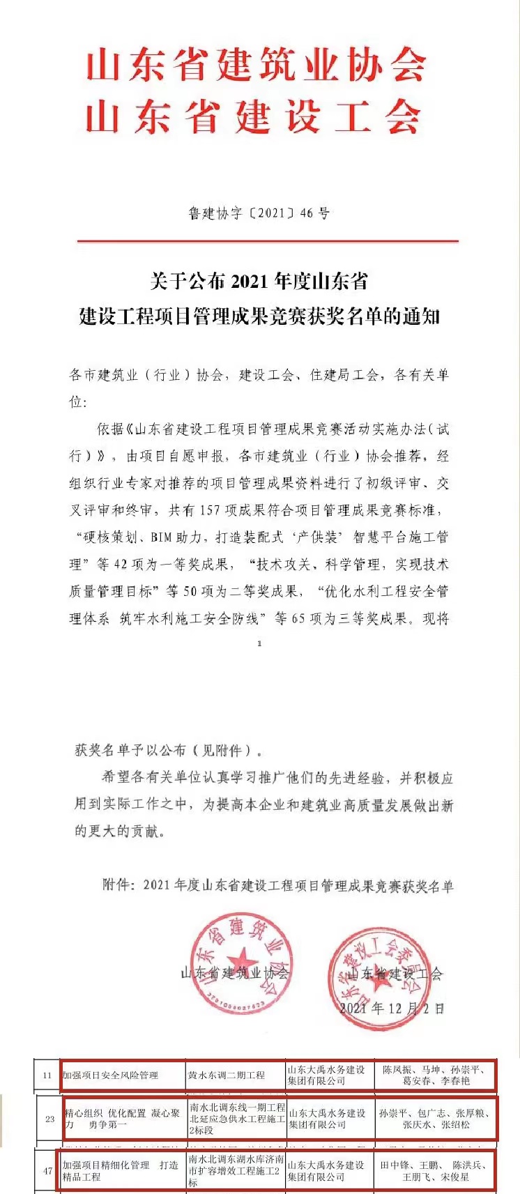 12月2日,2021年度山東省建設(shè)工程項目管理成果競賽獲獎名單揭曉,經(jīng)行業(yè)專家的初級評審、交叉評審和終審,全省共有157項成果符合項目管理成果競賽標準。其中,大禹集團“加強項目安全風(fēng)險管理”、“精心組織 優(yōu)化配置 凝心聚力 勇爭第一”、“加強項目精細化管理 打造精品工程”三項成果榮獲“2021年度山東省建設(shè)工程項目管理成果三等獎”。