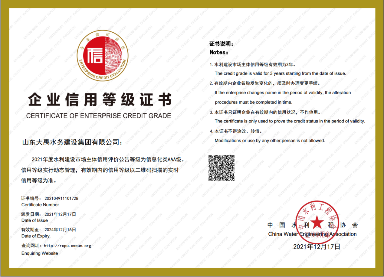 近日,大禹集團(tuán)喜獲2021年度水利建設(shè)市場(chǎng)主體(供貨、信息化單位)信用評(píng)價(jià)AAA等級(jí),在信用評(píng)價(jià)領(lǐng)域取得又一驕人成績(jī)。
