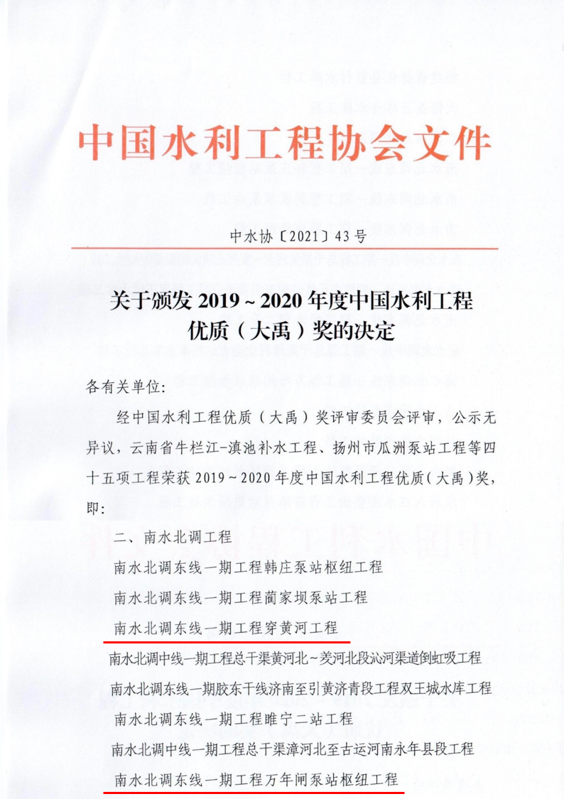 集團公司承建的“南水北調(diào)東線一期工程穿黃河工程”,權(quán)屬公司山東省水利水電建筑工程承包有限公司承建的“南水北調(diào)東線一期工程萬年閘泵站樞紐工程”雙雙通過2019-2020年度中國水利工程優(yōu)質(zhì)(大禹)獎評選 ,榮獲中國水利工程優(yōu)質(zhì)(大禹)獎榮譽稱號。