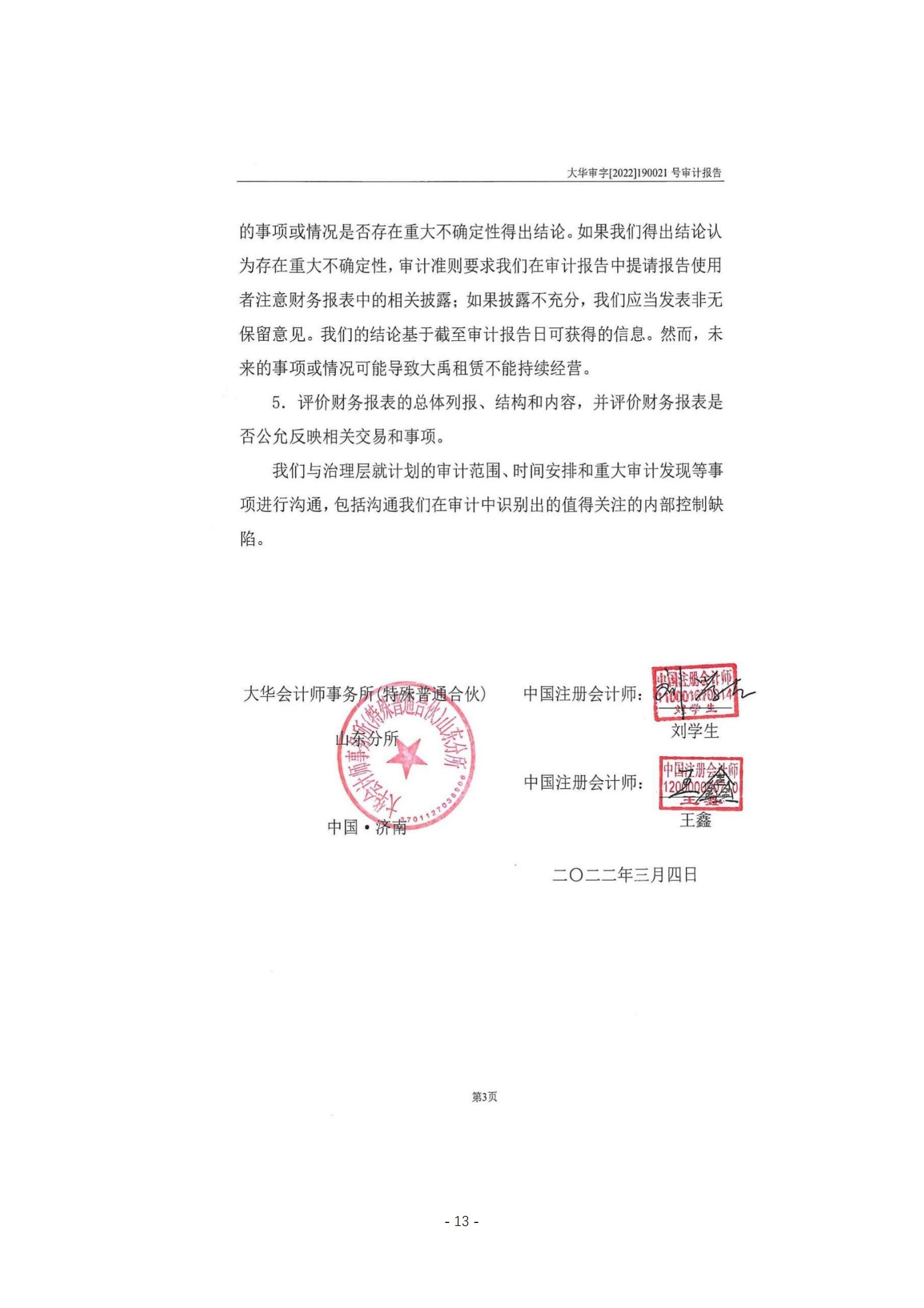 山東大禹設備租賃有限公司2021年度財務重大信息公告